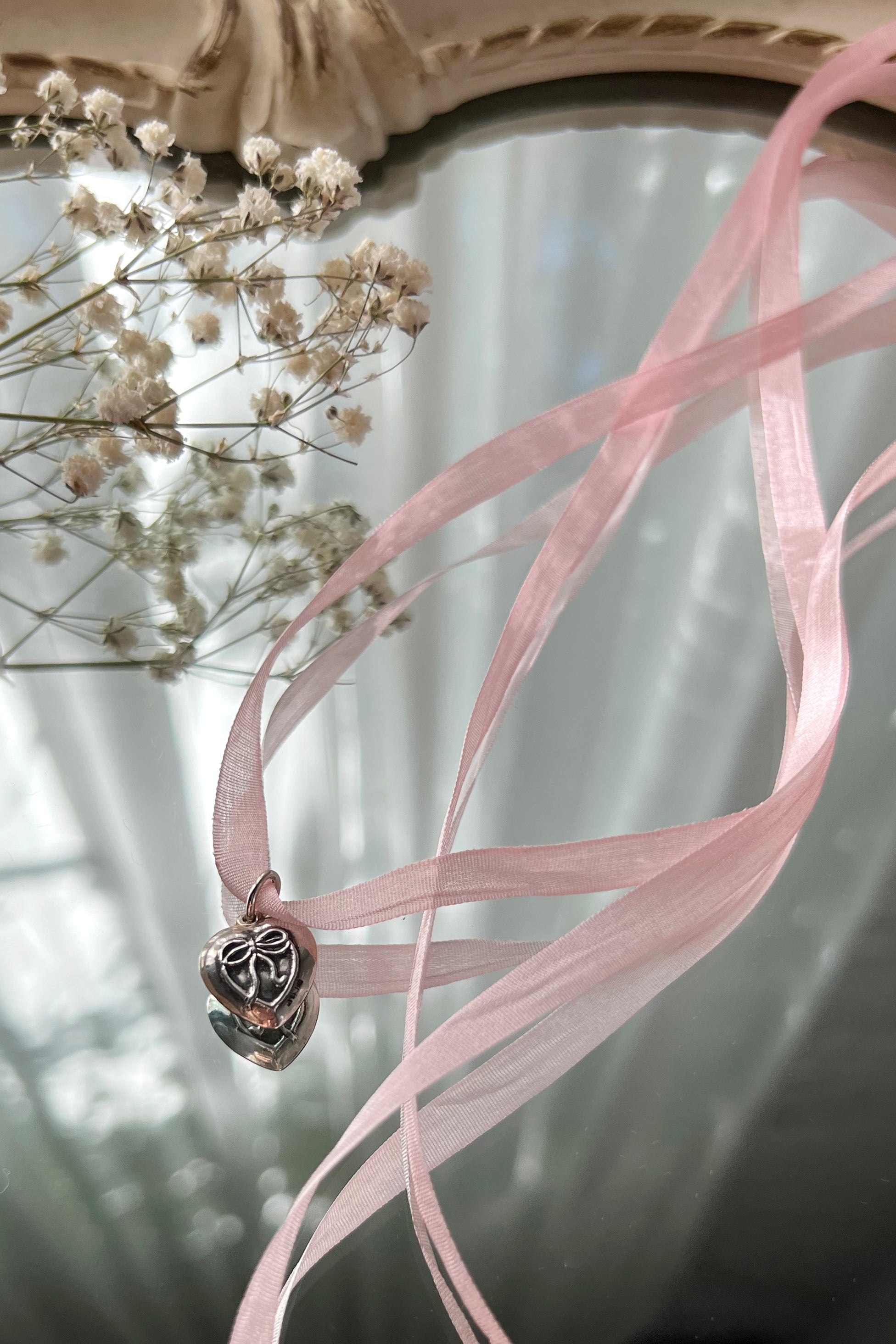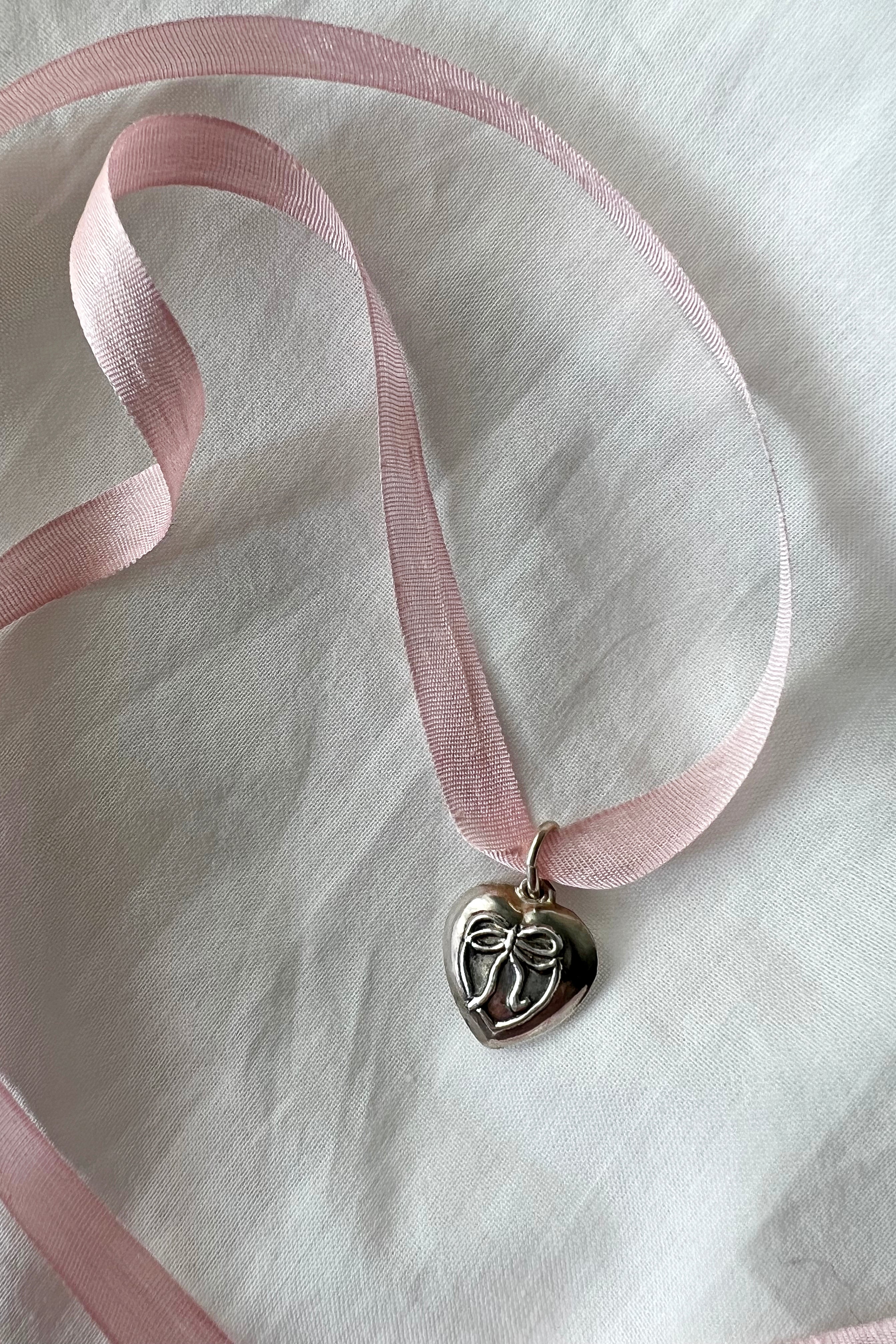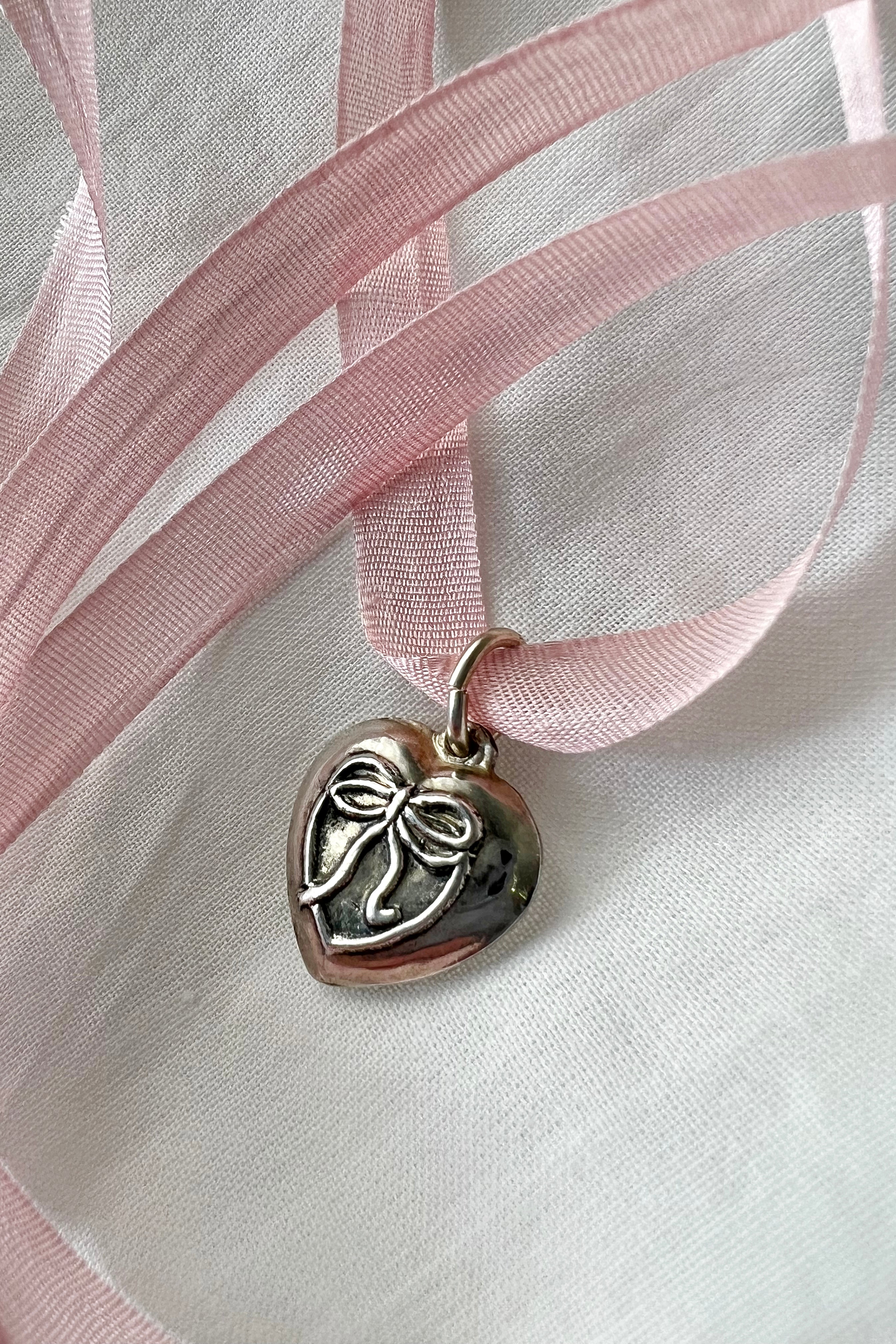 Add a touch of vintage romance to your wardrobe with a unique piece from our Vintage Hearts Collection! This ornate puffy heart charm features an intricate design with delicate details and is crafted from antiqued sterling silver - about 30 years old. Suspended from a soft and luxurious silk ribbon, it adds a girly touch to any outfit and is perfect for layering or wearing solo. Whether you're dressing up for a special occasion or just want to add a touch of femininity to your everyday style, this heart charm is the perfect accessory. Pair it with other delicate pieces from our collection for a look that is both timeless and on-trend.